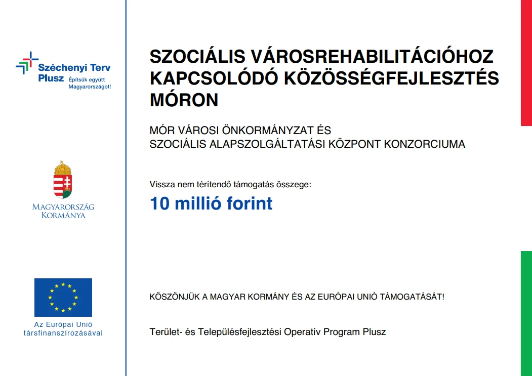 Mór Városi Önkormányzat a TOP_Plusz-6.2.1-23 kódszámú, Fenntartható versenyképes városfejlesztés című pályázati felhívásra támogatási kérelmet nyújt be a „Mór Város Fenntartható Városfejlesztési Stratégiája” és „Mór TOP Plusz Városfejlesztési Programterve 2021-2027” dokumentumokban nevesítésre került Mór Ipar utca korszerűsítése című projekt megvalósítása érdekében.